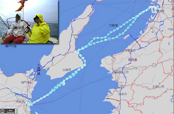 CanMoreにとって沼島より先は未知の海だ。徳島ケンチョピアは鳴門阿波踊りレースで、西日本のレーサーがいっぱい停泊していた。帰路、徳島を出てしばらくすると前線の通過に遭遇し、30ノットオーバーの風を受ける。
